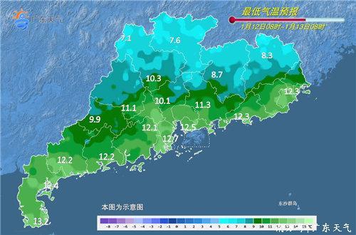 12日,珠三角南部和粤东市县多云到阴天,有分散性零星小雨,其余市县晴转多云。最低气温:粤北、珠三角北部市县4~8℃,南部沿海市县12~15℃,其余市县9~11℃。