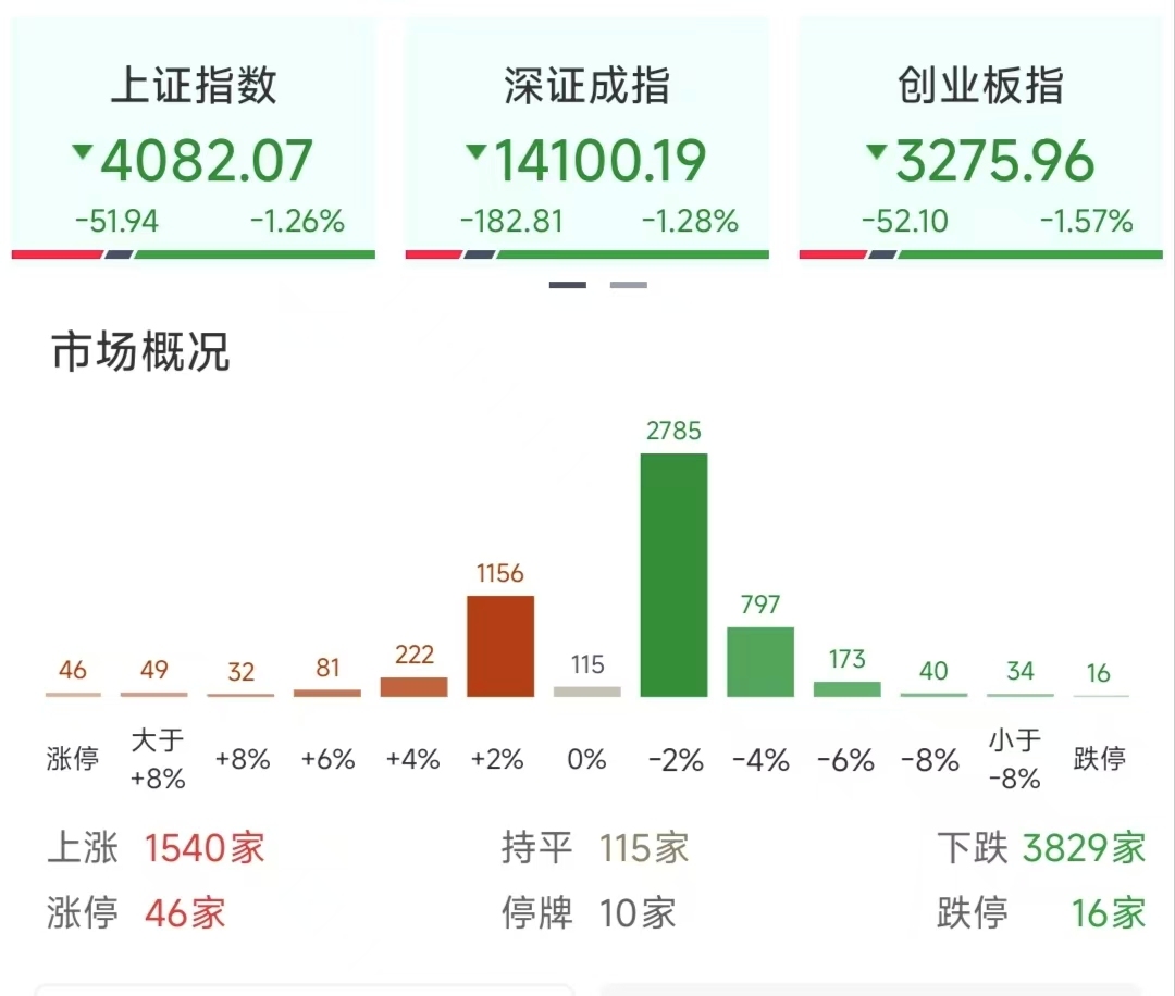 截至收盘,上证指数报4082.07点,下跌1.26%,失守4100点关口;深证成指报14100.19点,下跌1.28%;创业板指报3275.96点,下跌1.57%。沪深京三市成交额19989亿元,较前一交易日减少1618亿元,重回2万亿元下方。