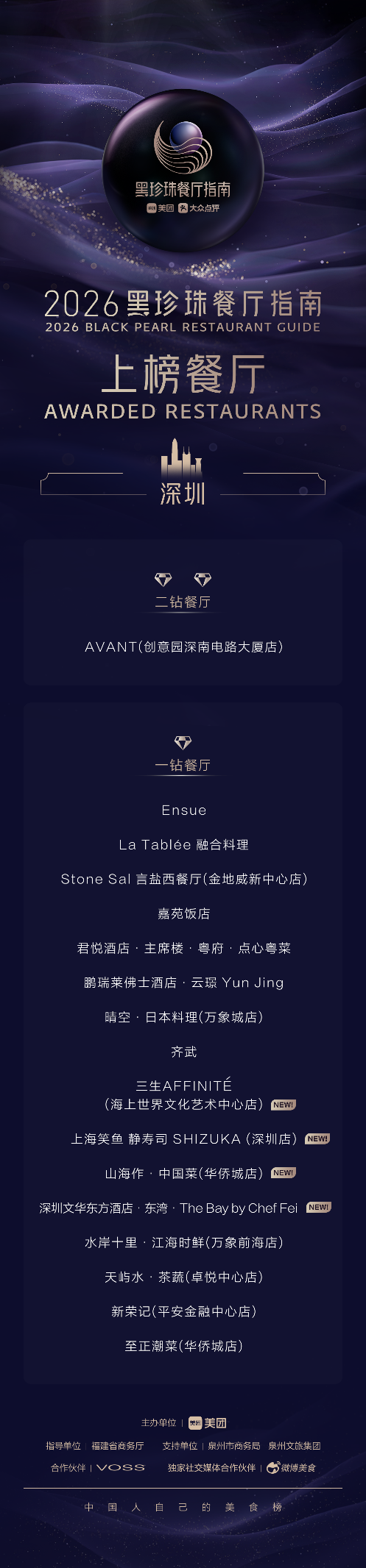 深圳新上榜4家餐厅,分别是主打粤菜的深圳文华东方酒店·东湾·The Bay by Chef Fei、创意菜山海作·中国菜(华侨城店)、西餐法国菜三生AFFINITÉ(海上世界文化艺术中心店)、日本寿司上海笑鱼 静寿司 SHIZUKA (深圳店),当地精致餐饮市场,持续保持着多元化的发展态势。