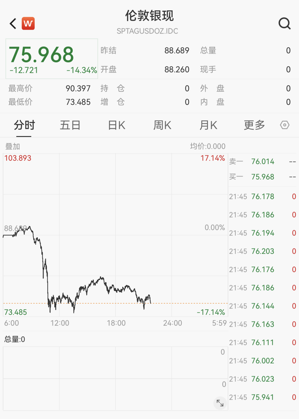 现货白银盘中一度跌逾17%