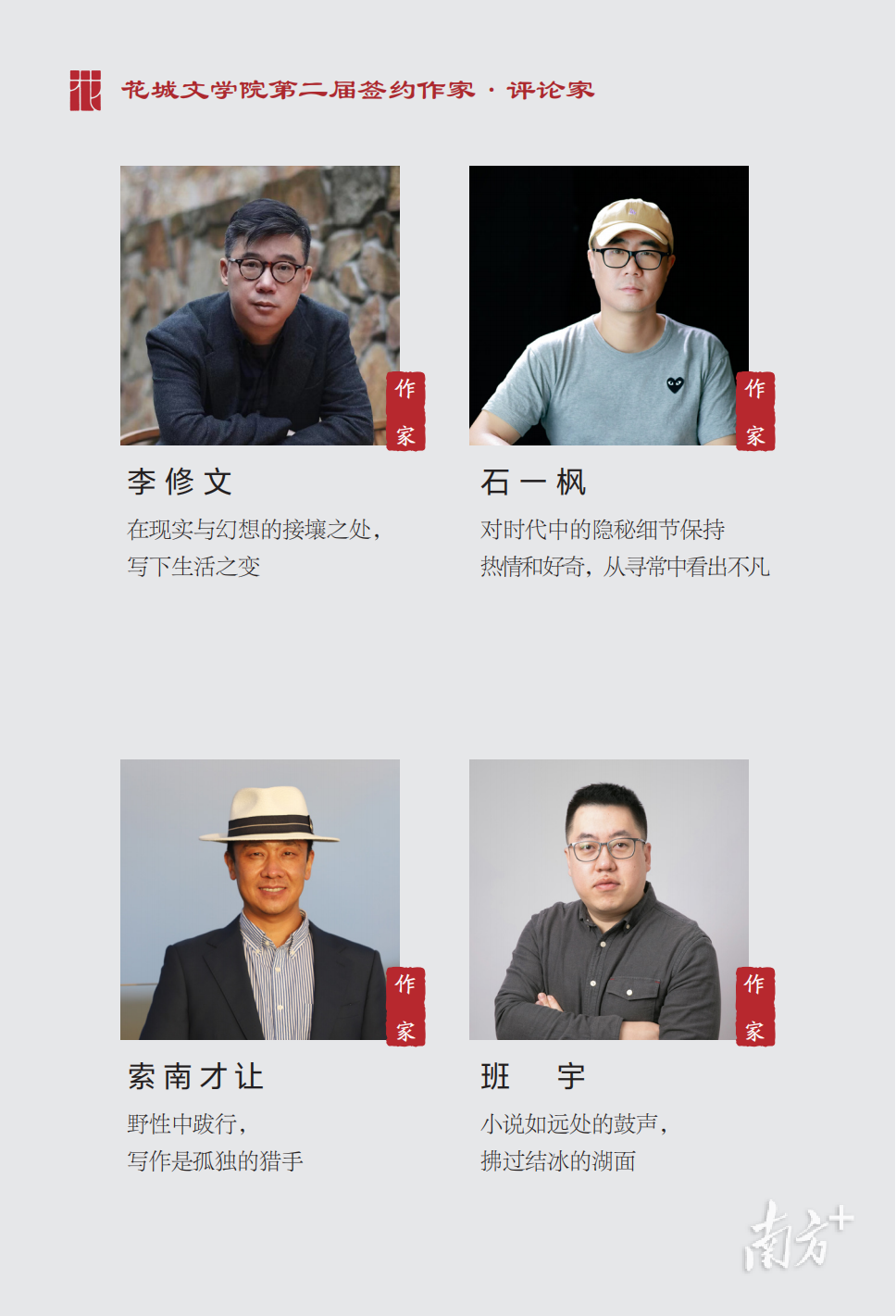 为进一步壮大创作谱系,在2025年9月的“阿勒泰·花城文学周”,花城文学院揭晓第二届签约作家与评论家阵容,汇集鲁迅文学奖得主李修文、石一枫,青年作家索南才让、班宇,非虚构作家黄灯、刘子超,以及评论家刘大先、项静等当代文学中坚力量,覆盖都市生活、草原叙事、教育观察、跨文化体验等多重维度,彰显了当代中国文学的丰富层次和时代多样性。