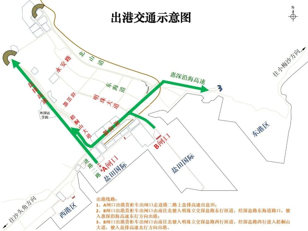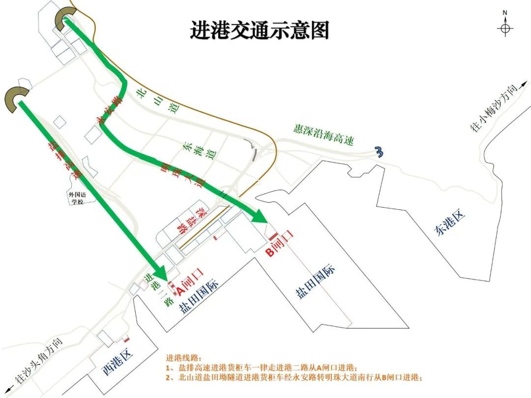 其中盐排高速由北向南进A闸,惠盐路-北山道-永安路-明珠道进B闸(可以理解为:必须经过盐田坳隧道或盐田隧道才能进港)。由坪山区、大鹏新区经坪盐通道、盐坝高速西行过来的车辆,无法在后方陆域直接进港,应当按照前述交通组织在盐排高速或惠盐路排队进港。