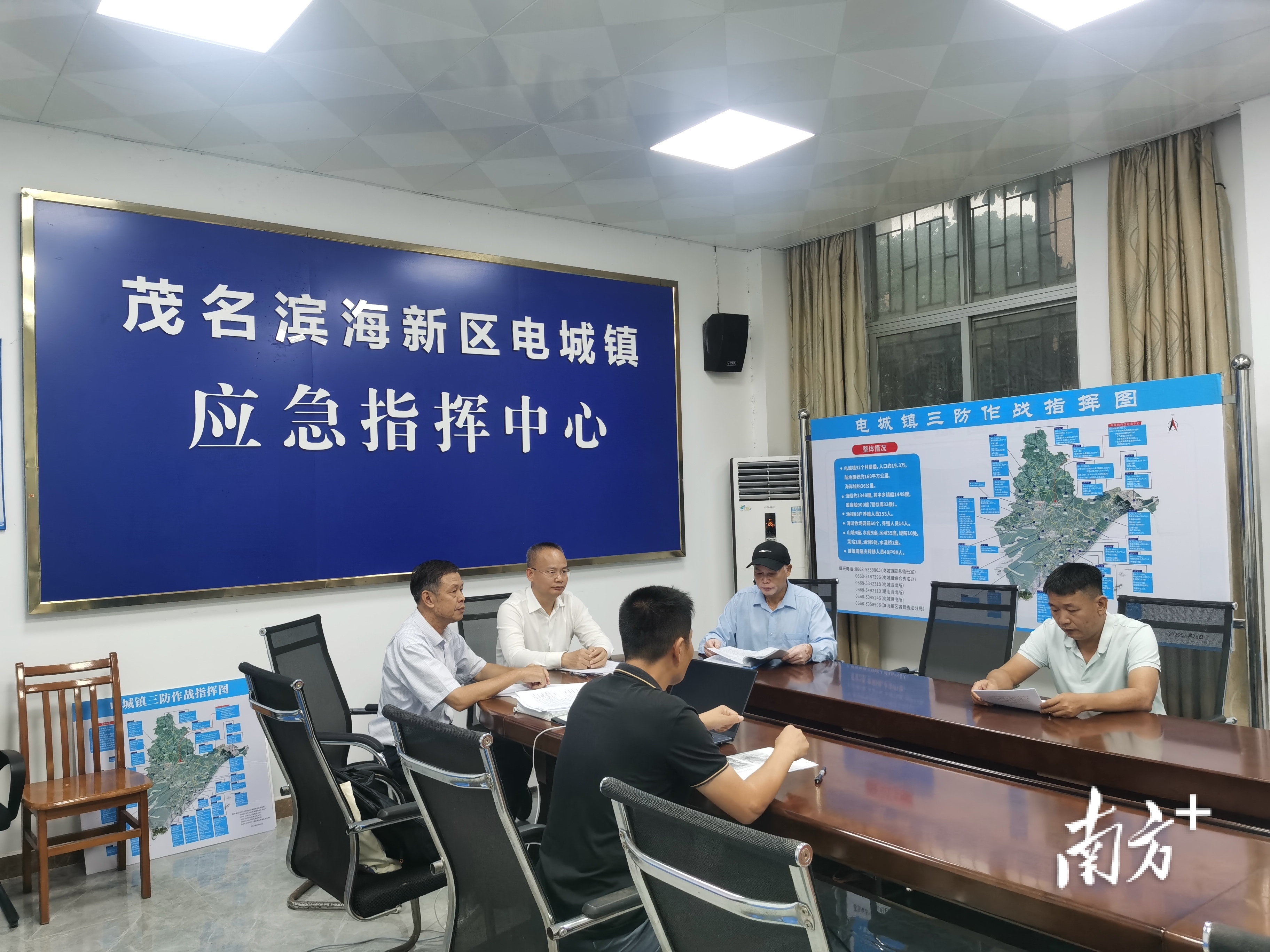 电城镇应急指挥中心挂起三防作战指挥图,图示清晰划分各个区域防御细节,方便干部根据台风动态及时调整部署措施。