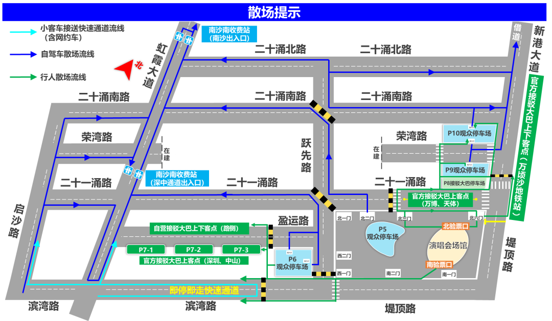 演出日期间,每天13:00—17:00,主办单位将在万顷沙地铁站安排循环接驳公交(凭演唱会门票免费),观众在新港大道下车后,可步行前往北验票口。