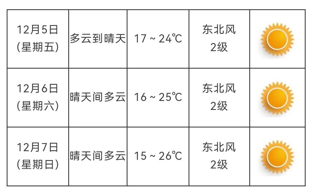 其中,12月5日多云到晴天,17—24℃,东北风2级;6日晴天间多云,16—25℃,东北风2级;7日晴天间多云,15—26℃,东北风2级。