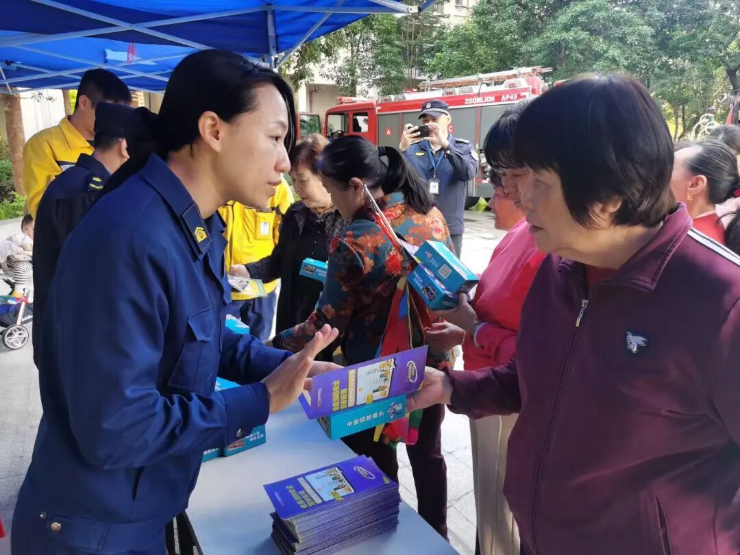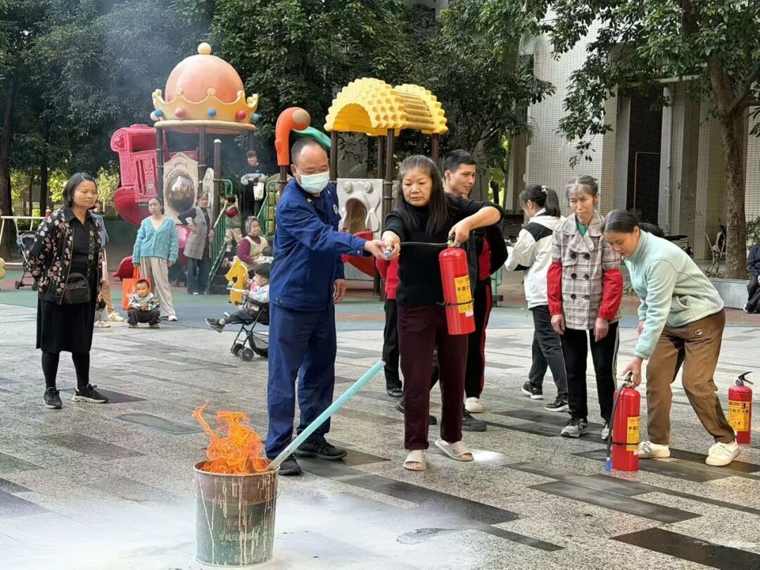 演练结束后,消防救援大队工作人员现场开展灭火器材实操教学,通过“手把手”指导,让居民熟练掌握灭火器“提、拔、握、压”的正确使用方法。此外,消防救援大队还联合城管分局、团委、平安法治办等部门,通过发放宣传手册、现场答疑等形式,向居民普及用火、用气、用电安全知识,重点讲解高层住宅火灾逃生技巧、电动车安全停放充电等注意事项,提高居民的消防安全意识。