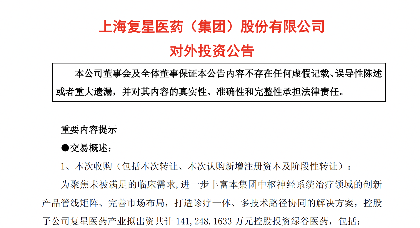 12月15日,复星医药宣布其控股子公司复星医药产业拟出资约人民币14.12亿元,控股收购绿谷(上海)医药科技有限公司。收购完成后,绿谷医药将成为复星医药控股子公司。