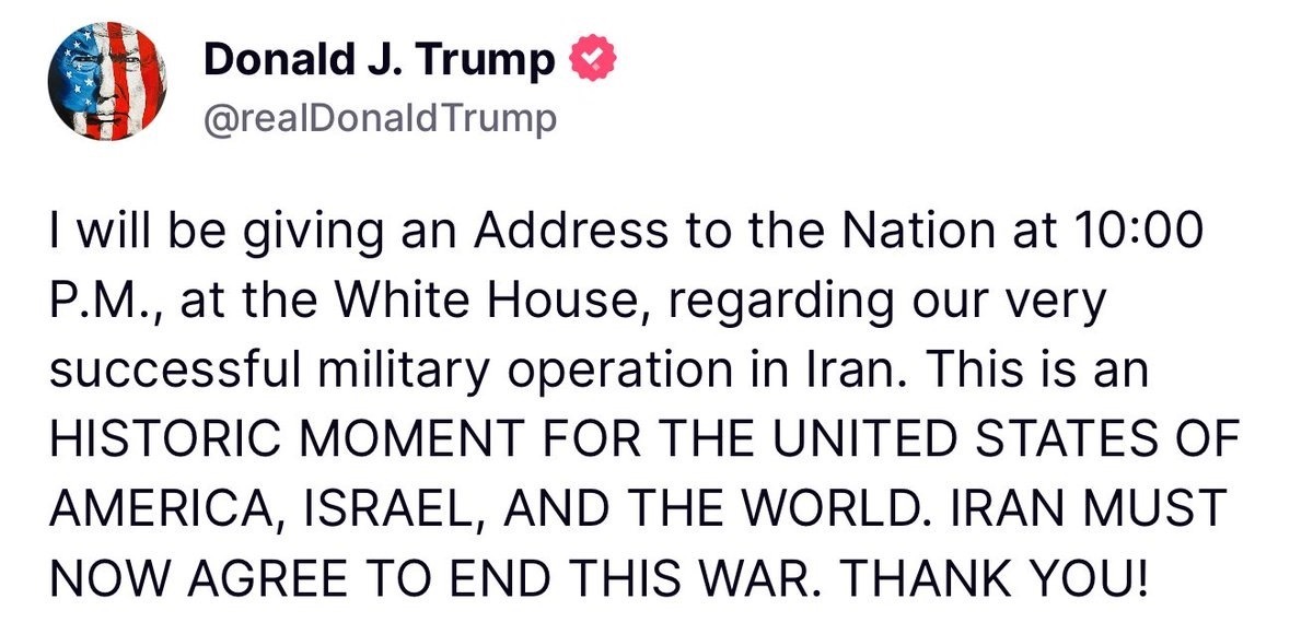 当地时间6月21日,美国总统特朗普在其社交媒体“真实社交”上发文称,他将在美国东部时间22时就空袭伊朗向全国发表讲话。特朗普称,“伊朗必须同意结束这场战争”。