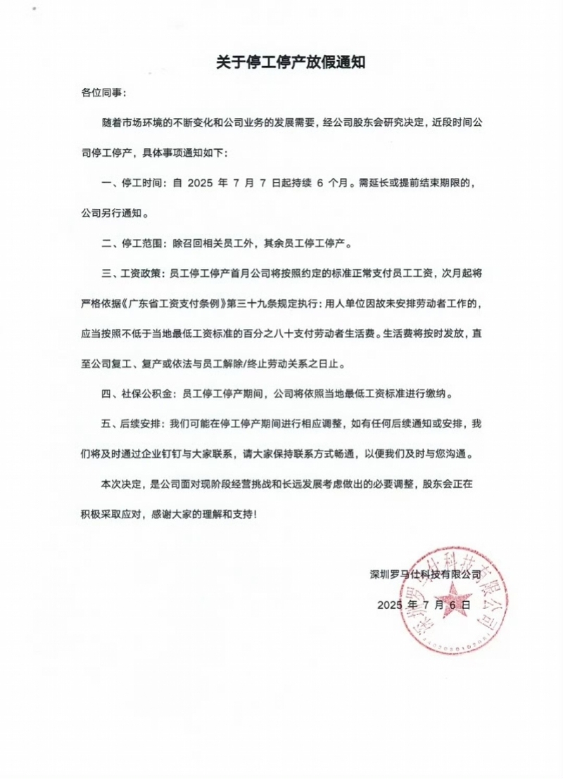 通知还表示,公司可能在停工停产期间进行相应调整,如有任何后续通知或安排,公司将及时通过企业钉钉与员工联系。本次决定,是公司面对现阶段经营挑战和长远发展考虑做出的必要调整,股东会正在积极采取应对,感谢大家的理解和支持。