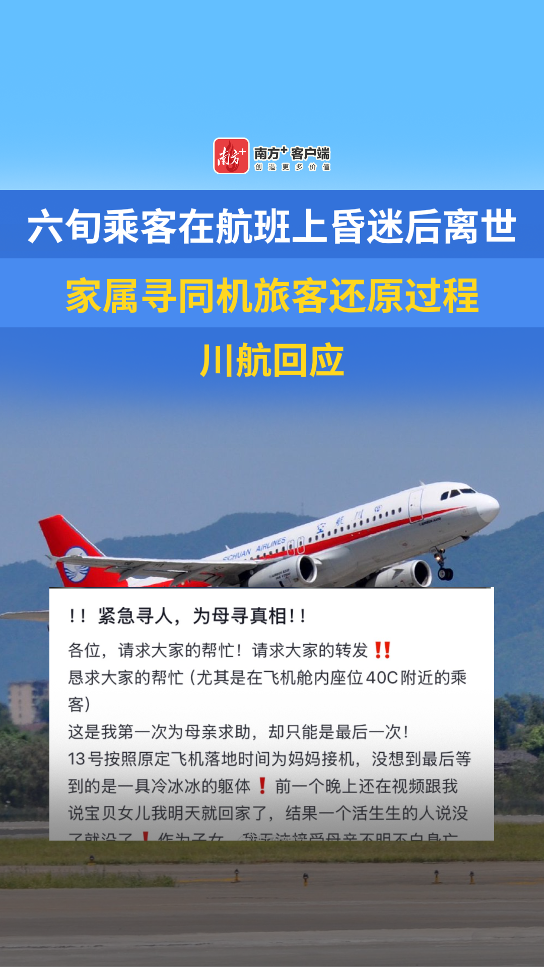 六旬乘客在航班上昏迷后离世,家属寻同机旅客还原过程,川航回应