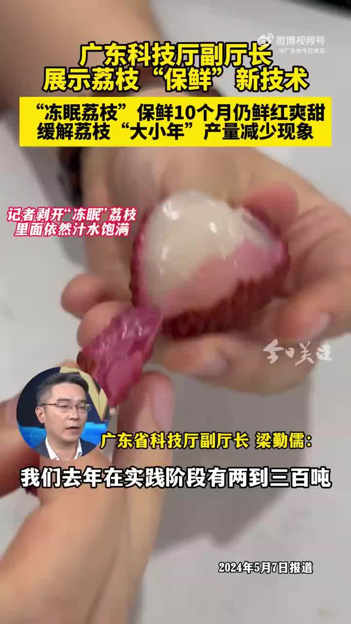 受持续暴雨影响,今年广东的荔枝可能减产,市场价会大幅上涨。5月7日,广东省科技厅副厅长梁勤儒在节目上展示了冻眠荔枝。据介绍,去年6月,广东运用超低温冻眠锁鲜技术,保存了二三百吨新鲜采摘的荔枝,目前已经陆续投放市场。详情>>
