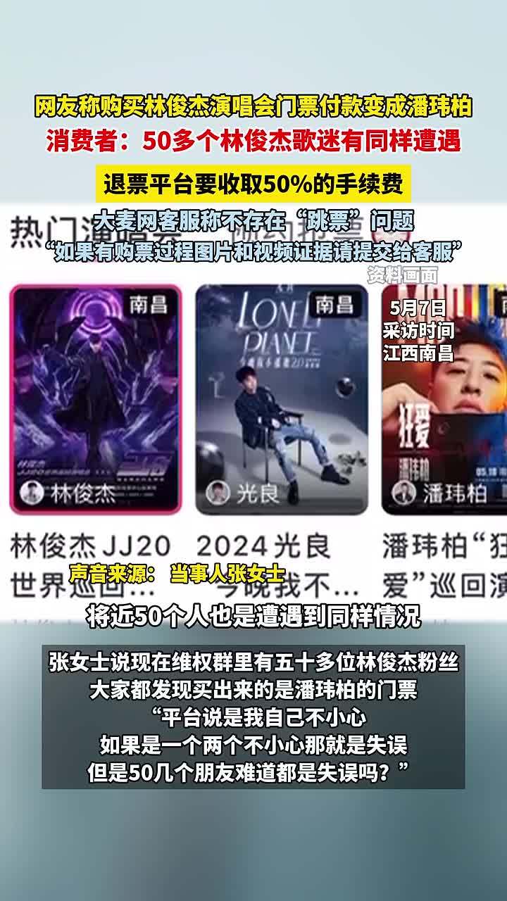 5月6日晚,有网友在社交平台反映,自己在大麦网购买林俊杰南昌演唱会门票时疑似遭遇“跳票”,付完款后,林俊杰演唱会门票竟然变成了潘玮柏演唱会门票,而如果要退票就要收取50%的手续费,大家觉得很不合理。详情>>