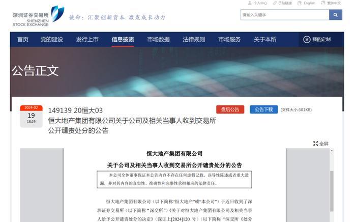2月19日晚间,恒大地产发布公告称,公司于近日收到了深交所《关于对恒大地产集团有限公司及相关当事人给予公开谴责处分的决定》及上交所《关于对恒大地产集团有限公司及有关责任人予以公开谴责的决定》。