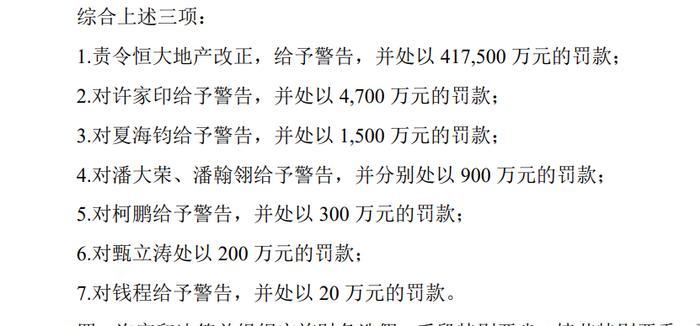 综上,证监会责令恒大地产改正,给予警告,并处以41.75亿元的罚款;对许家印给予警告,并处以4700万元的罚款;对夏海钧给予警告,并处以1500万元的罚款;对潘大荣、潘翰翎给予警告,并分别处以900万元的罚款;对柯鹏给予警告,并处以300万元的罚款;对甄立涛处以200万元的罚款;对钱程给予警告,并处以20万元的罚款。