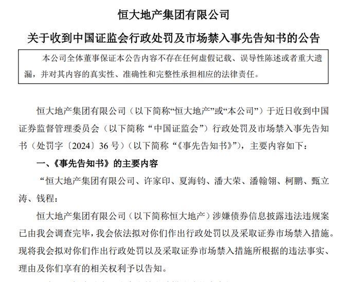 恒大地产表示,其及相关责任人于近日收到证监会行政处罚及市场禁入事先告知书(处罚字〔2024〕36号)(以下简称《事先告知书》),主要内容涉及恒大地产年度报告涉及虚假记载、恒大地产债券涉嫌欺诈发行及恒大地产未按规定及时披露相关信息等,此外还有对上述违法行为所作出的处罚规定。