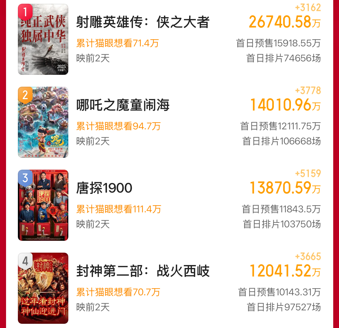 目前共有4部春节档新片预售票房破亿,分别是《射雕英雄传:侠之大者》(2.67亿元)、《哪吒之魔童闹海》(1.4亿元)、《唐探1900》(1.38亿元)、《封神第二部:战火西岐》(1.2亿元)。