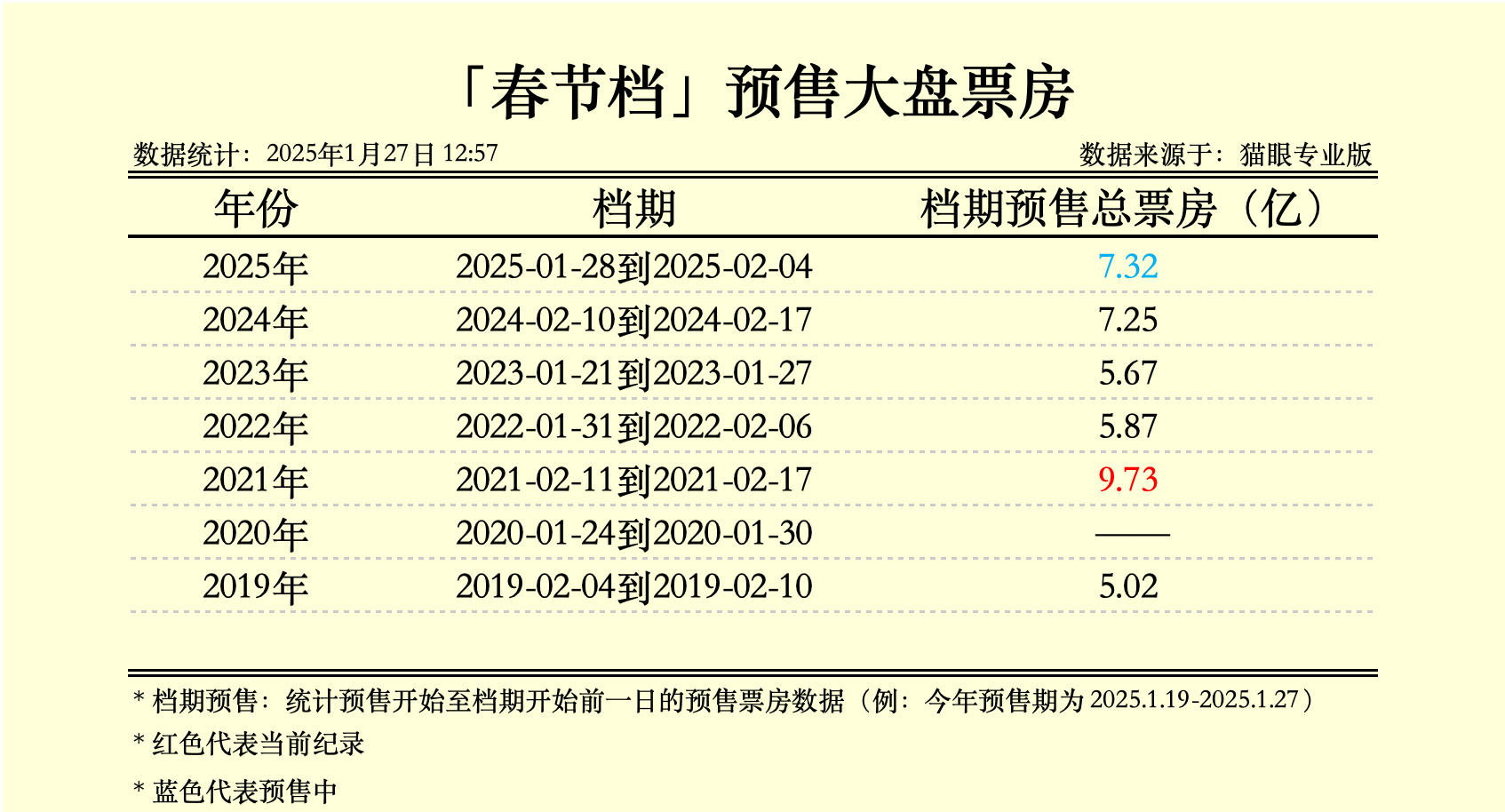 据猫眼专业版数据,1月27日12时57分,2025年春节档(1月28日-2月4日)预售总票房达7.32亿元,超2024年春节档预售票房7.25亿元成绩。