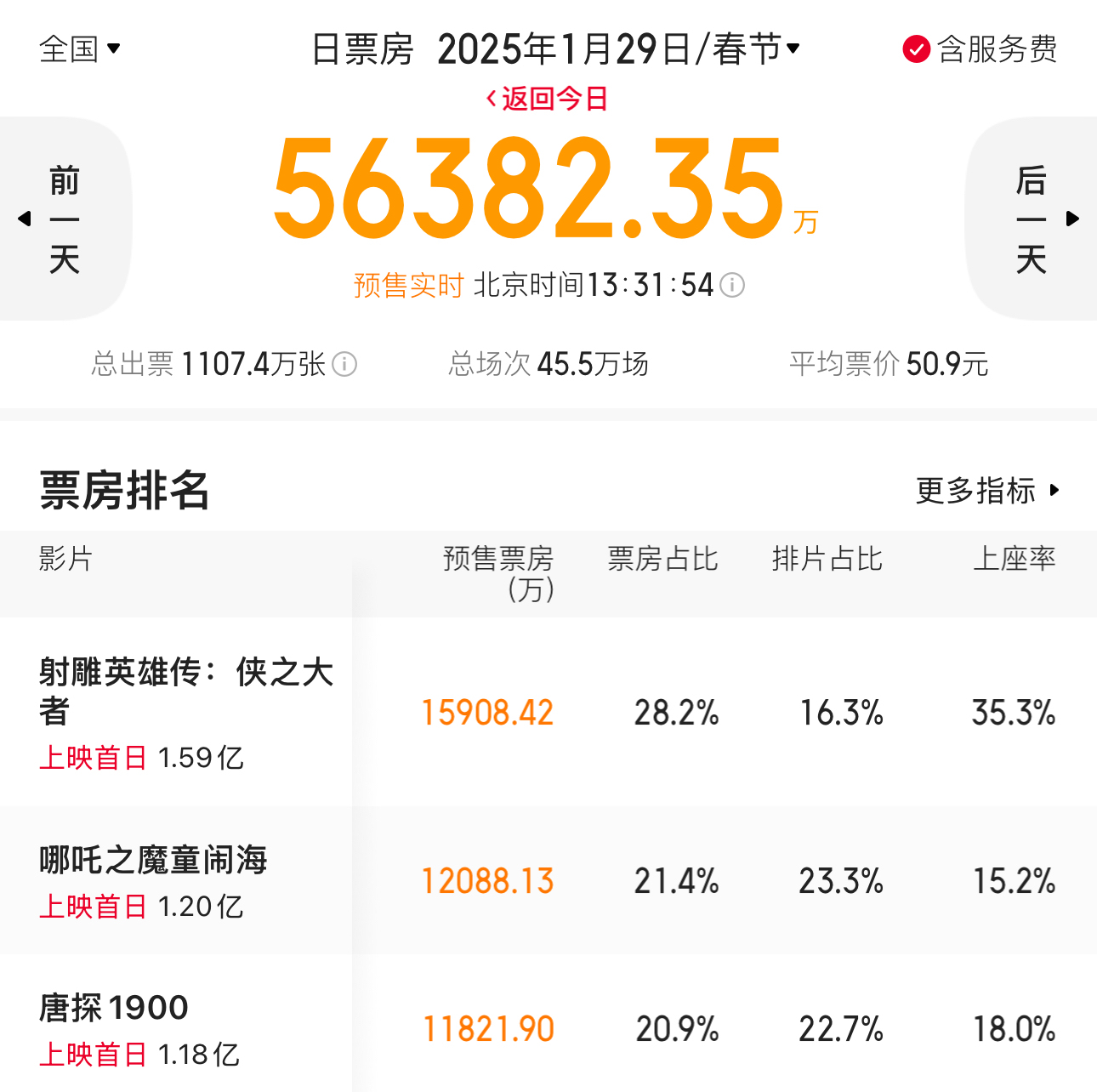 今年春节档6部新片均为大年初一上映,截至1月27日13时31分,1月29日(大年初一)单日预售票房已突破5.6亿元,《射雕英雄传:侠之大者》《哪吒之魔童闹海》《唐探1900》分列大年初一票房榜前三位。