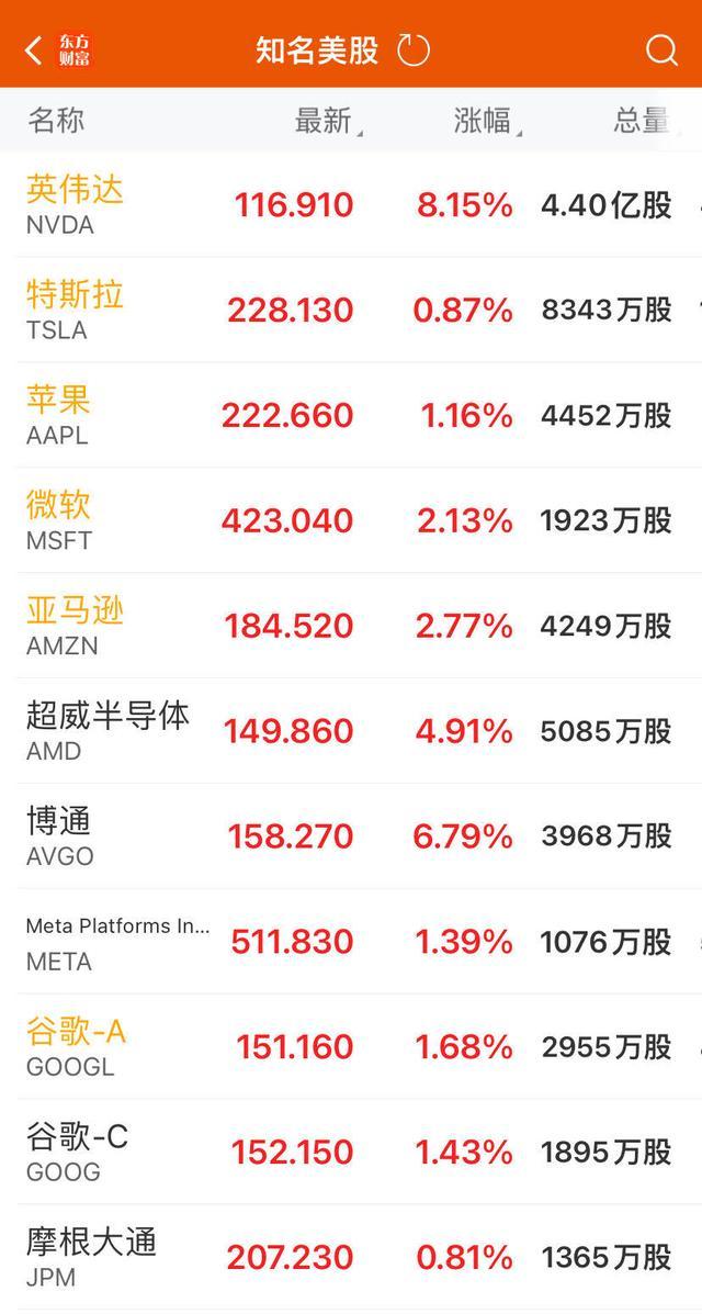 费城半导体指数涨近5%,创8月9日以来最大单日涨幅。大型科技股普涨,英伟达涨超8%,创8月以来最大单日涨幅;英特尔涨超3%,亚马逊、微软涨超2%,苹果、奈飞、谷歌、Meta涨超1%,特斯拉小幅上涨,超微电脑收涨7.92%。
