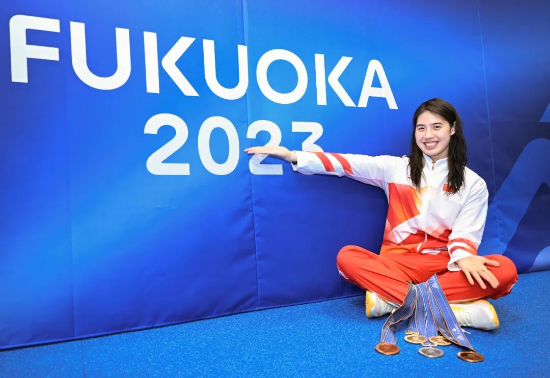这是2023年7月30日,张雨霏在2023年世界游泳锦标赛后展示奖牌。新华社记者 夏一方 摄
