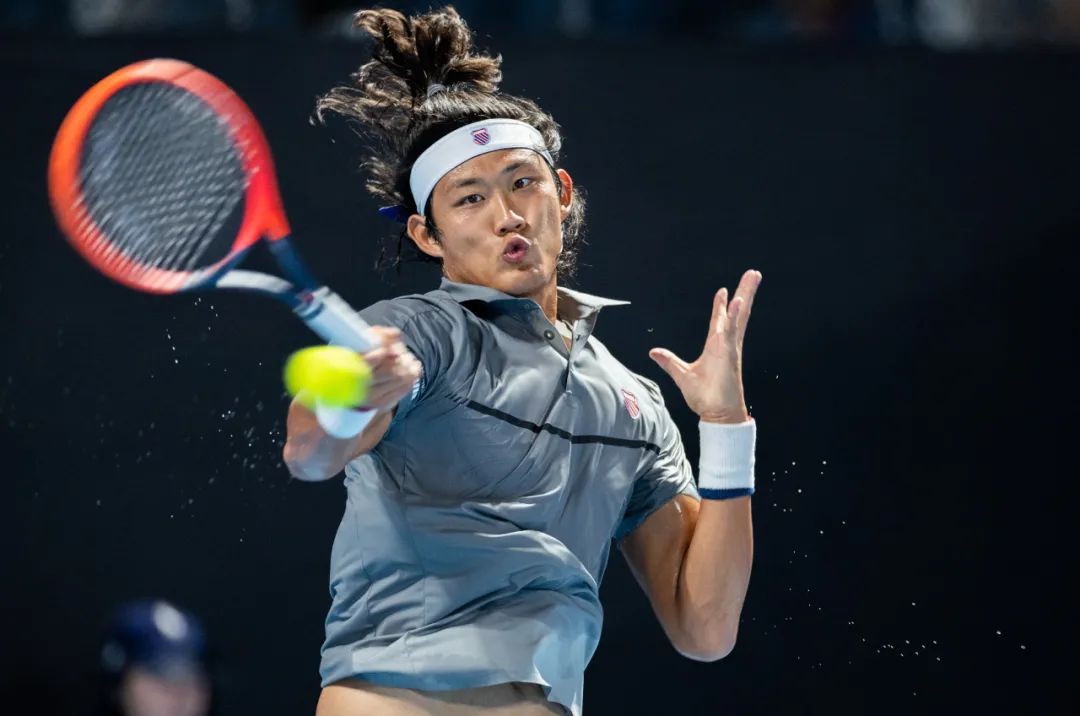 这是2023年1月17日,张之臻在2023年澳大利亚网球公开赛男子单打首轮比赛中回球。新华社发(胡泾辰摄)