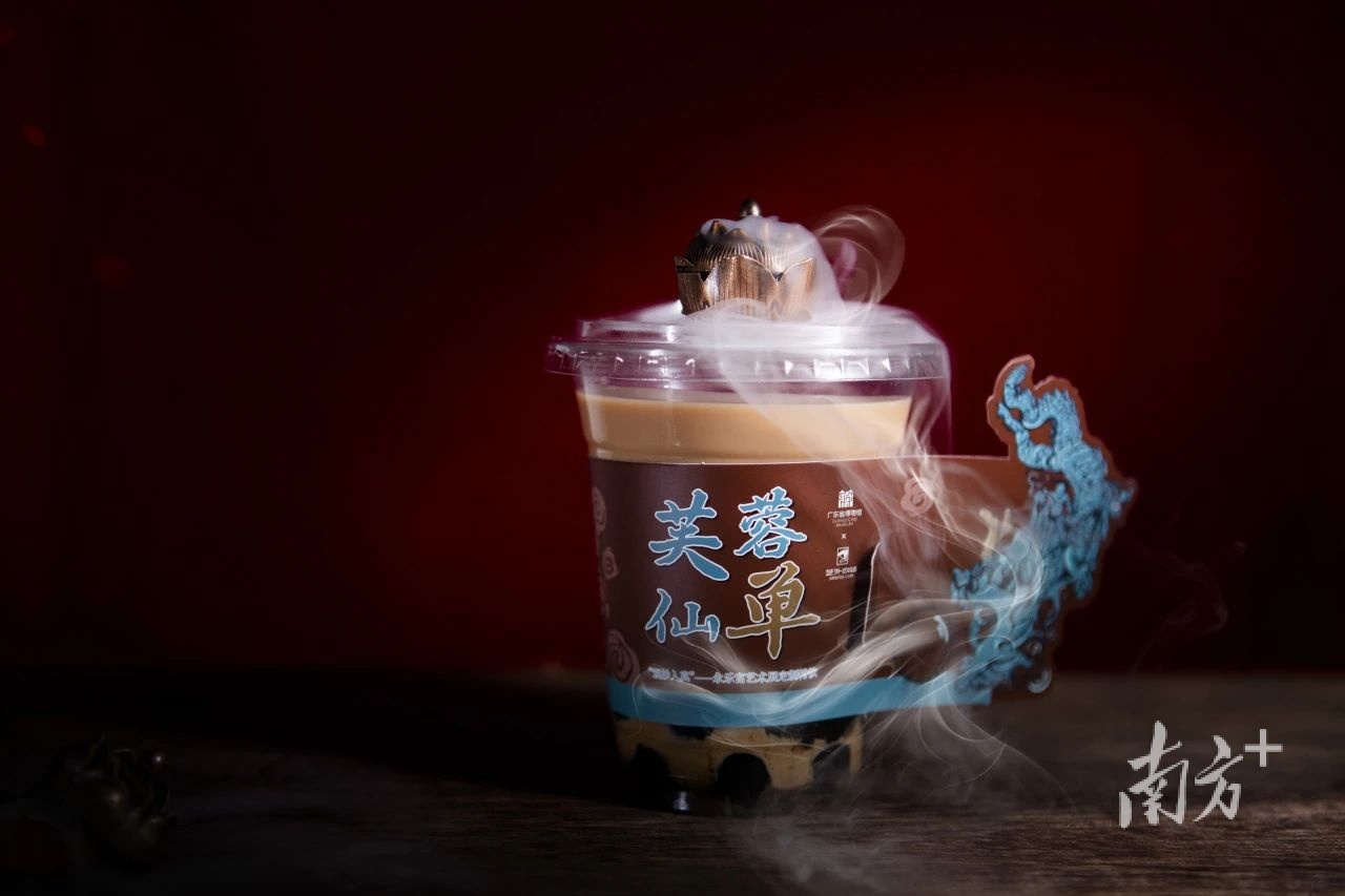 比如这款结合“观妙入真——永乐宫艺术展”开发的“芙蓉仙单”,就是选用了广东人民最喜欢的港式珍珠奶茶(拿铁)。杯子上除了有三清殿屋脊鸱吻元素,还有一个莲花“盖帽”作为点缀。莲花里面置一点干冰,一时流烟轻舞,让观众联想到展览主题,映合腾云与仙鹤元素,与展览的匹配度极高。博物馆里有为了展览来买饮品的观众,也有喝完这杯饮品想要去“打卡”展览的消费者。