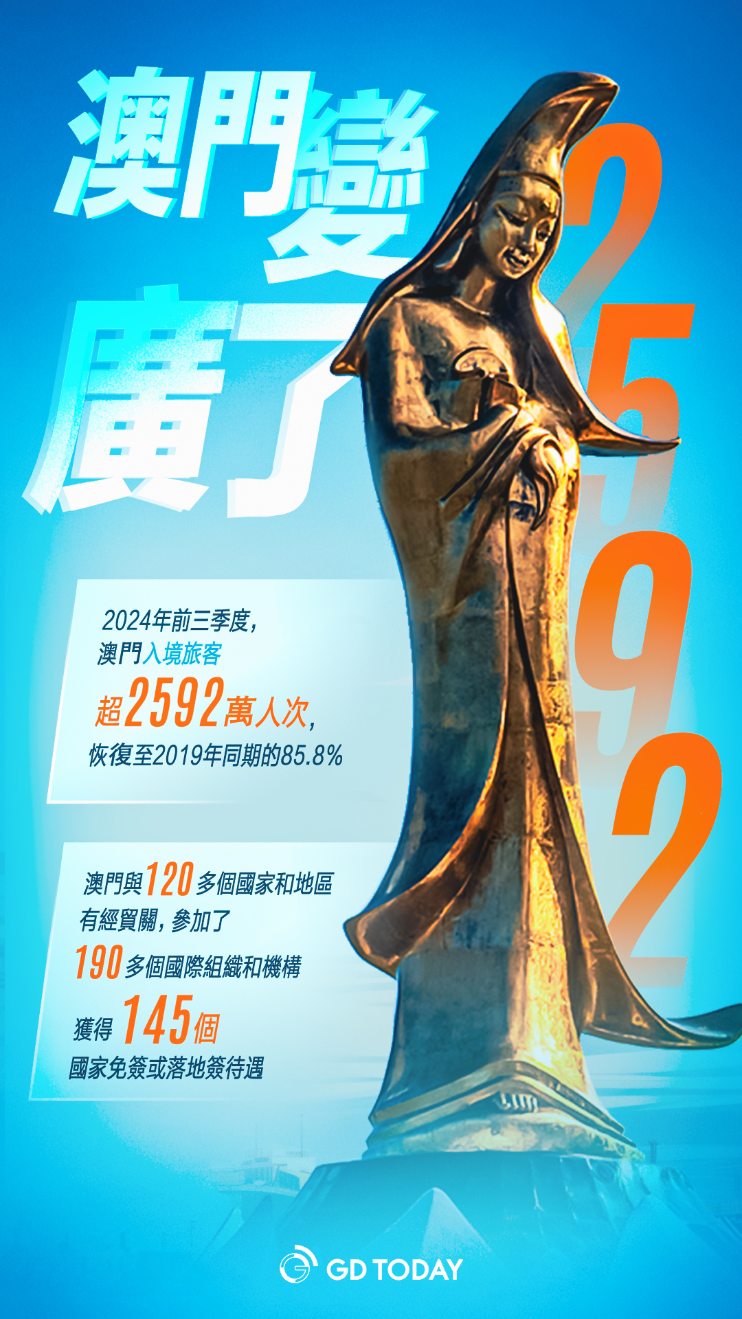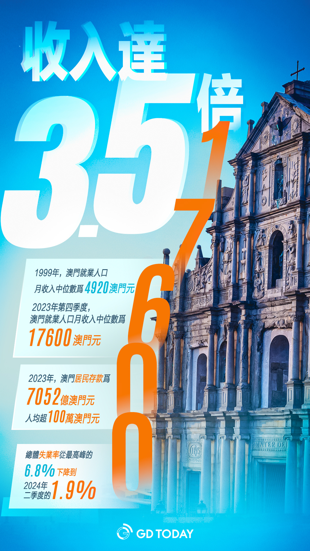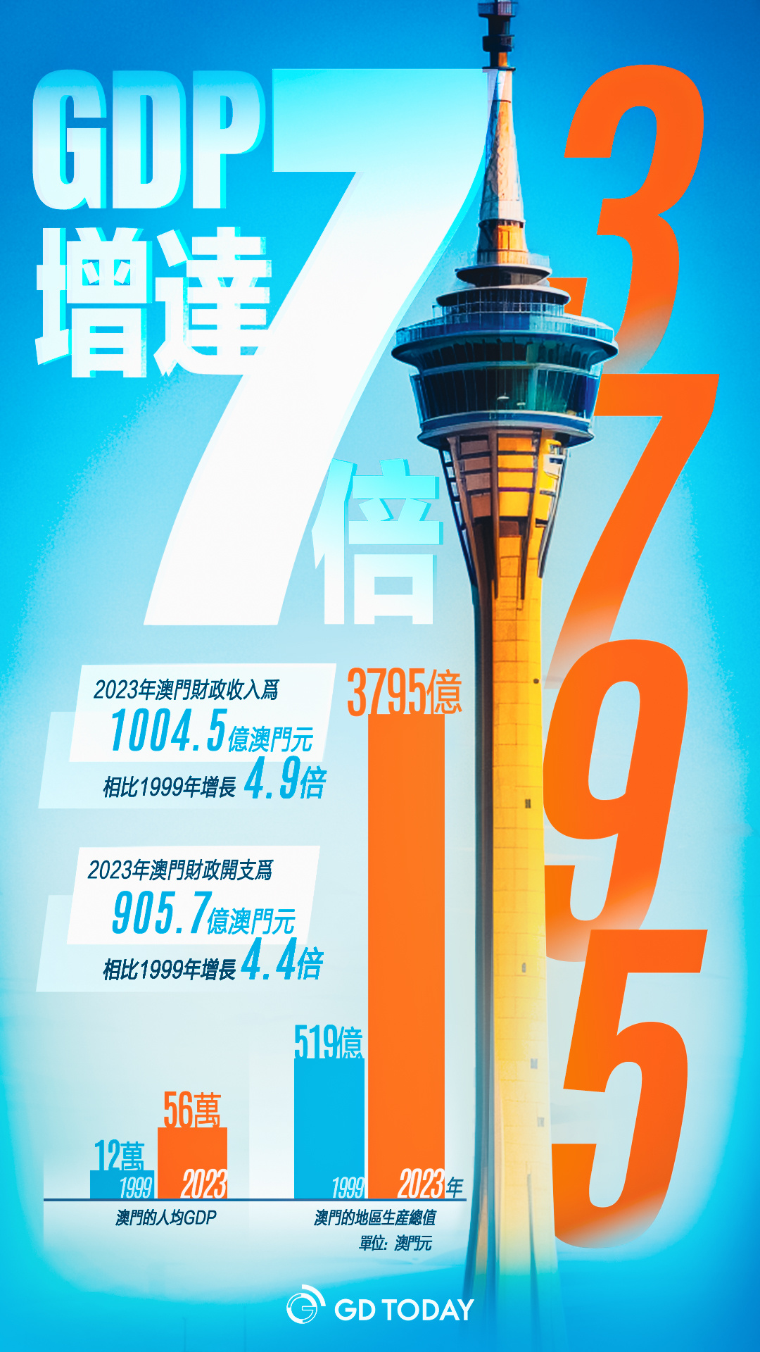 2023年,澳门本地生产总值约为3795亿澳门元,是1999年的7倍;澳门人均本地生产总值约56万澳门元,全球排名第5位;面积从1999年的22平方公里,增长至如今的33.3平方公里……澳门,“长大”了!澳门,成了祖国的掌上明珠!