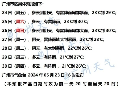 广州方面, 预计,24日-26日多雷雨,局部雨势大;展望27日-28日有一次大到暴雨降水过程。