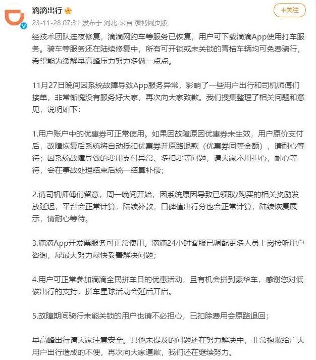11月27日晚间,全国多地网友在社交平台反馈称,滴滴出行App“崩了”,不显示定位且无法打车。11月28日早间,滴滴出行官方微博发文道歉,称滴滴网约车等服务已恢复。