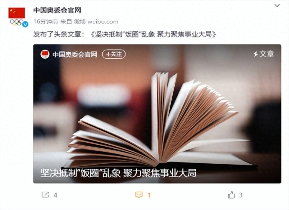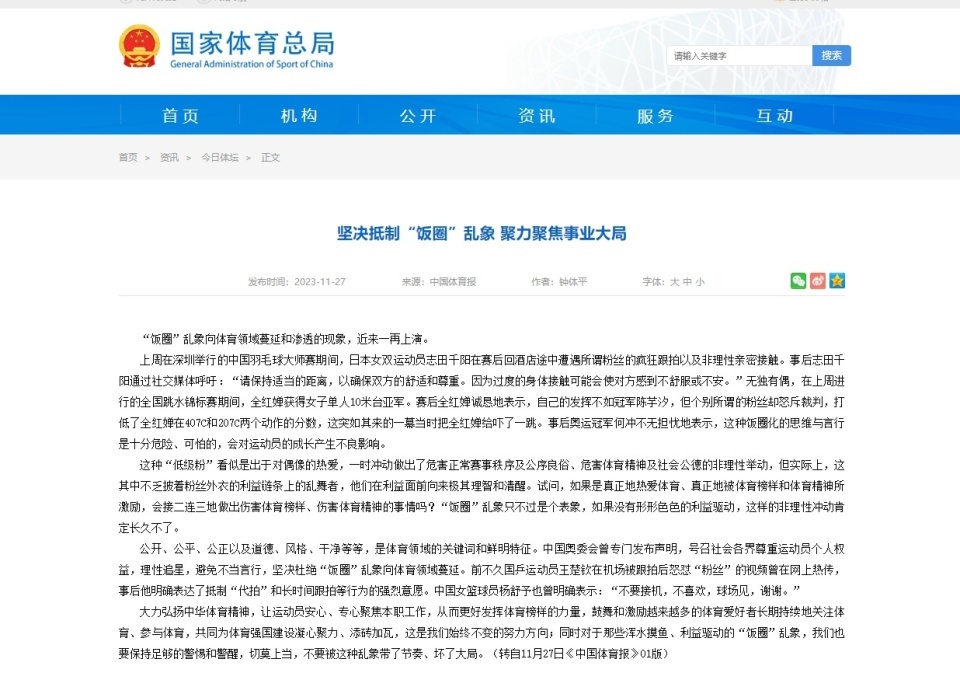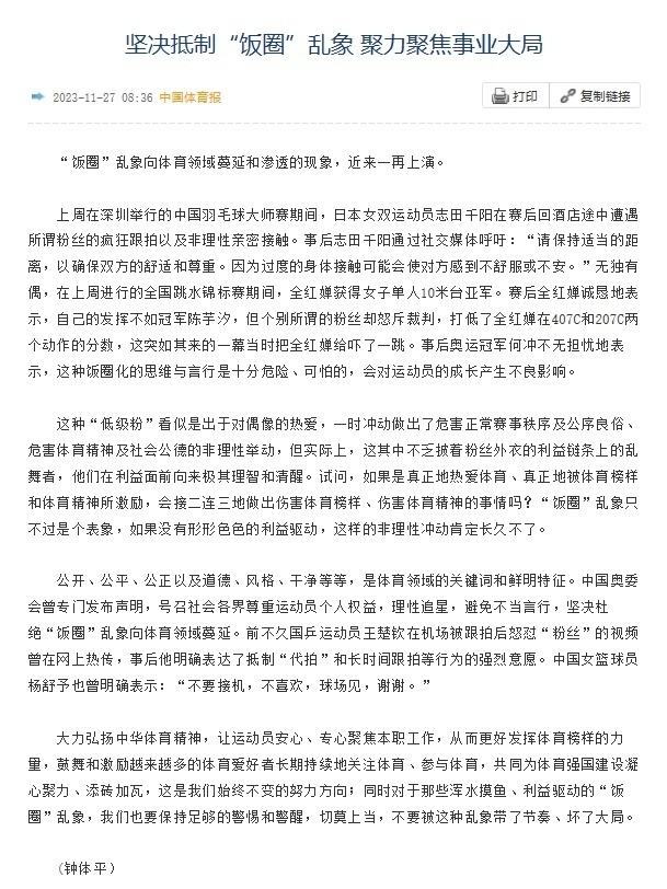 11月27日,中国奥委会官网转载中国体育日报文章《坚决抵制“饭圈”乱象 聚力聚焦事业大局》。