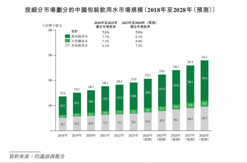 根据灼识咨询报告,按零售额计,饮用纯净水是中国包装饮用水市场最大的细分市场,于2023年达到人民币1206亿元,占中国包装饮用水市场的56.1%。预计该细分市场将持续增长,到2028年零售额将达到人民币1798亿元,占中国包装饮用水市场的57.2%。