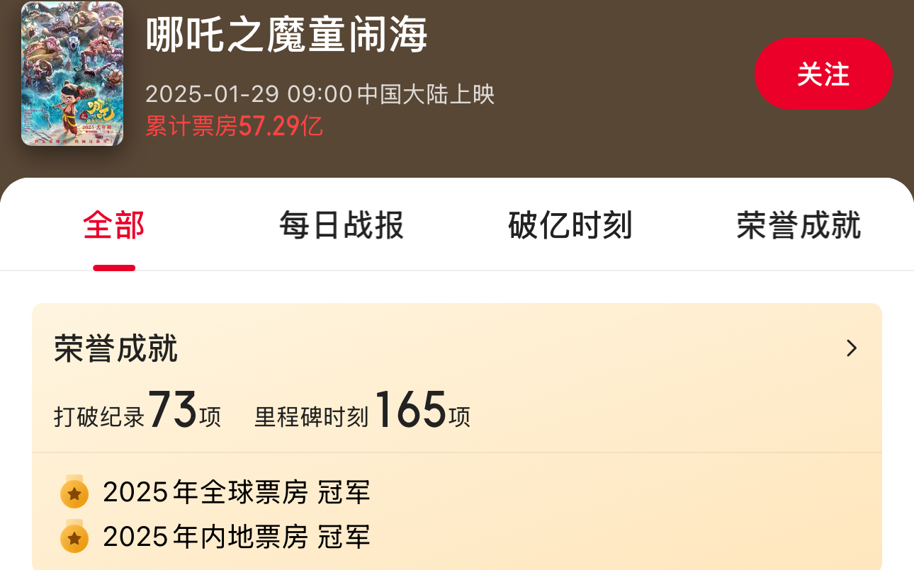 此外,据猫眼专业版统计,《哪吒之魔童闹海》上映9天以来,共打破73项纪录,暂列2025年全球票房冠军。