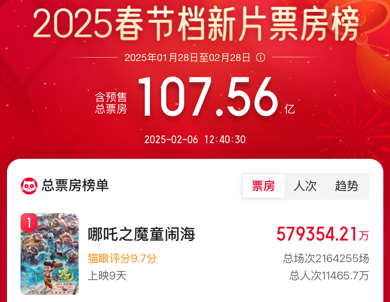 据猫眼专业版统计,截至2月6日12时40分,电影《哪吒之魔童闹海》累计票房(含预售)突破57.9亿元,超《长津湖》票房成绩,登顶中国电影票房榜。