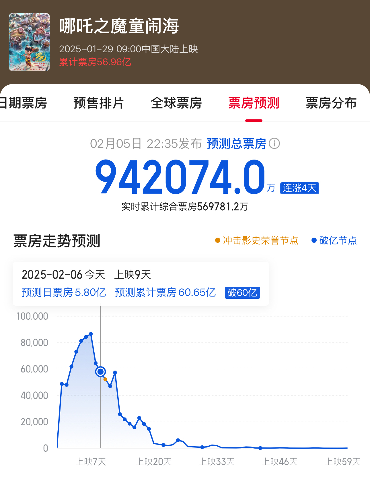 该片今日预测全天票房约5.8亿元,内地总票房预测高达94.2亿元。