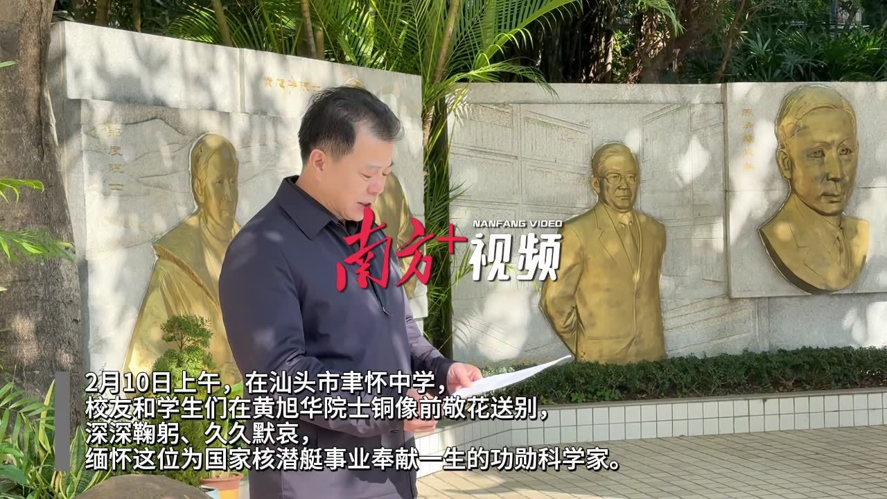 千里之外的母校,汕头市聿怀中学黄旭华铜像前摆满鲜花。校友、师生、教育界人士代表们一一在黄旭华铜像前敬花送别,深深鞠躬、久久默哀,缅怀这位为国家核潜艇事业奉献一生的功勋科学家。