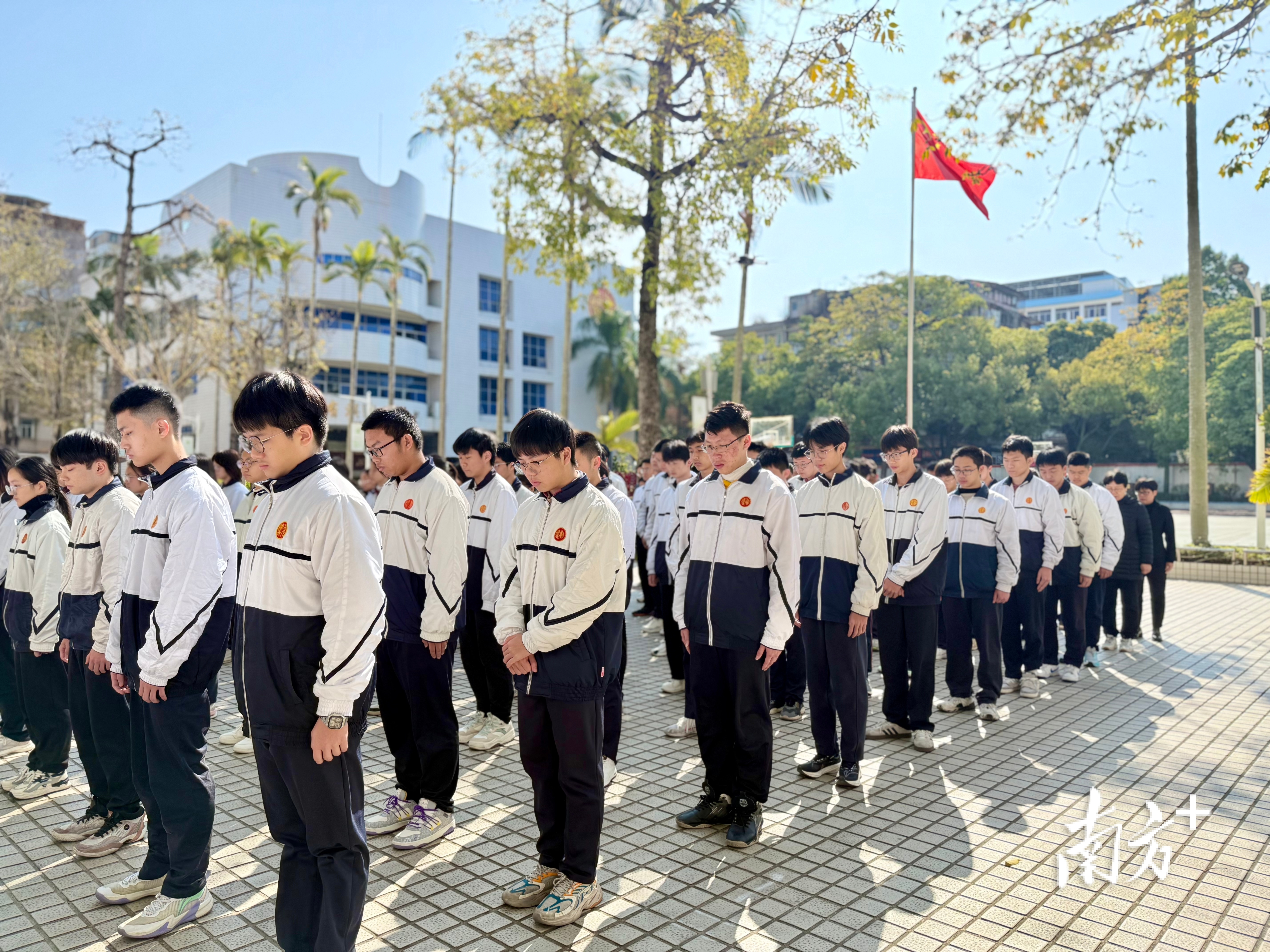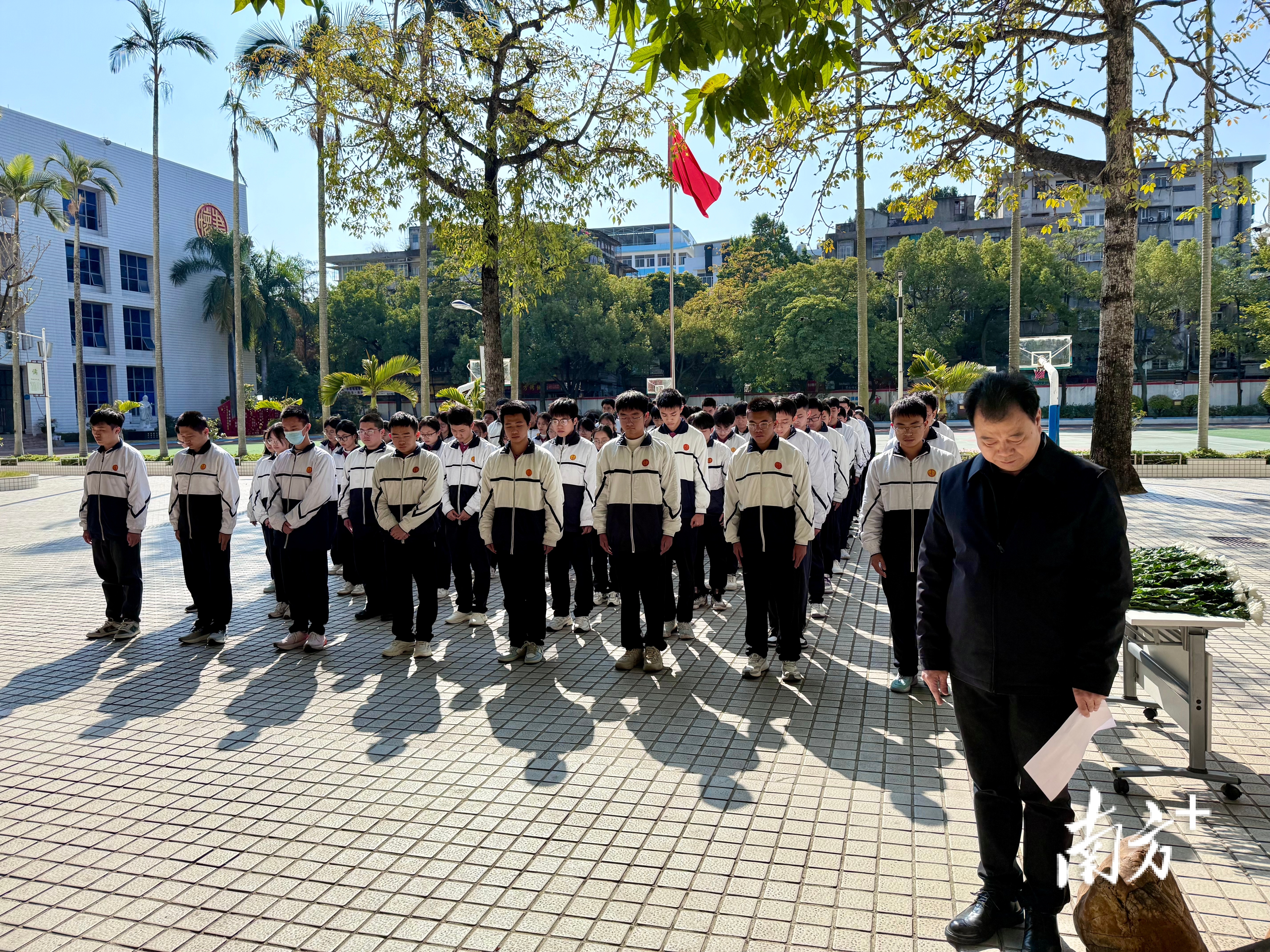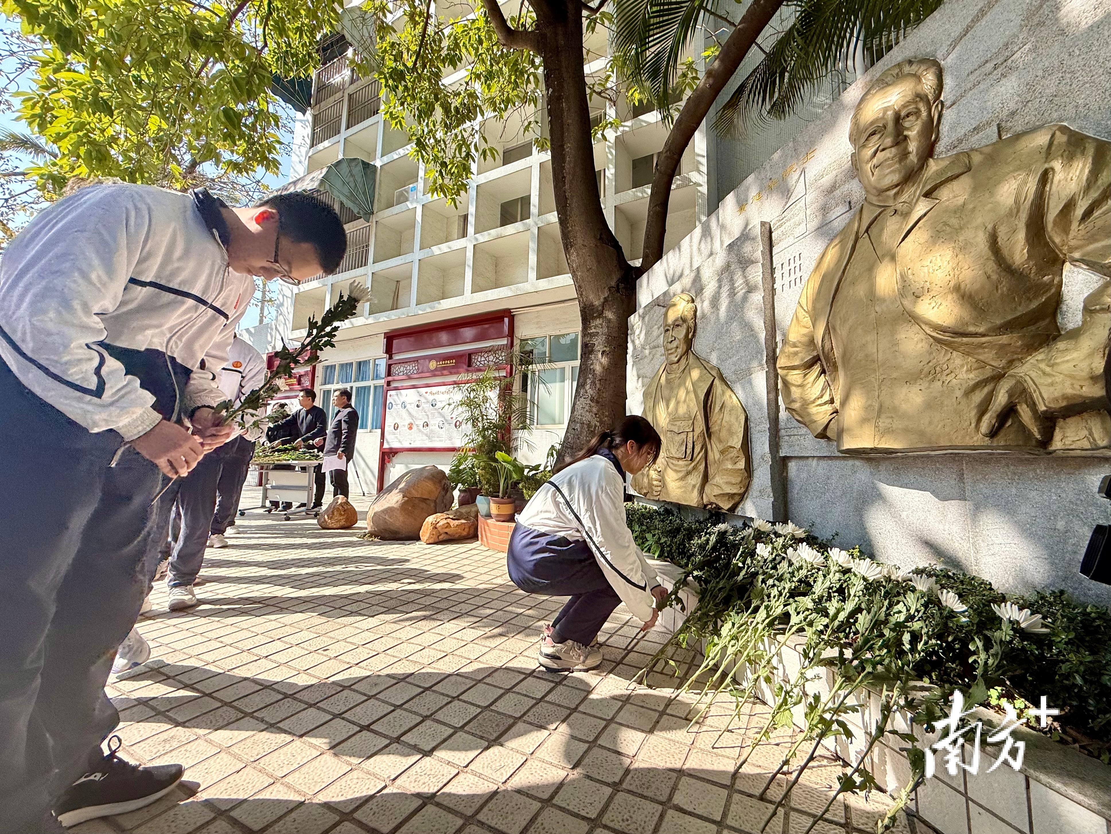 上午10时,在汕头市聿怀中学,校友、师生们一同默哀三分钟。低头致意的青年学生、含泪献花的校友代表、庄重注目的教育界人士……在铜像前,前来悼念的队伍里,许多人难掩沉痛。