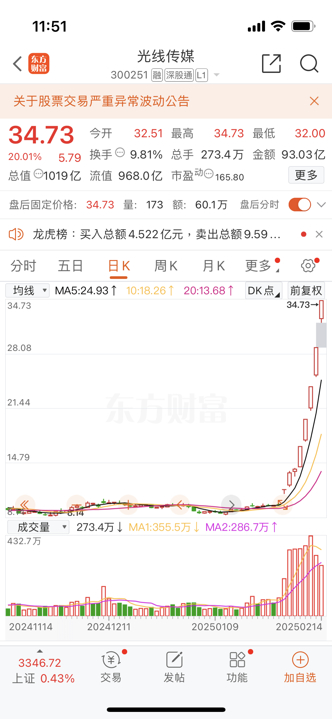截至2月14日收盘,光线传媒已录得8天6个涨停板,股价累计涨幅超过264%,市值更是首次突破千亿大关,从春节后第一个交易日的280亿元至今,短短8天翻了三倍。