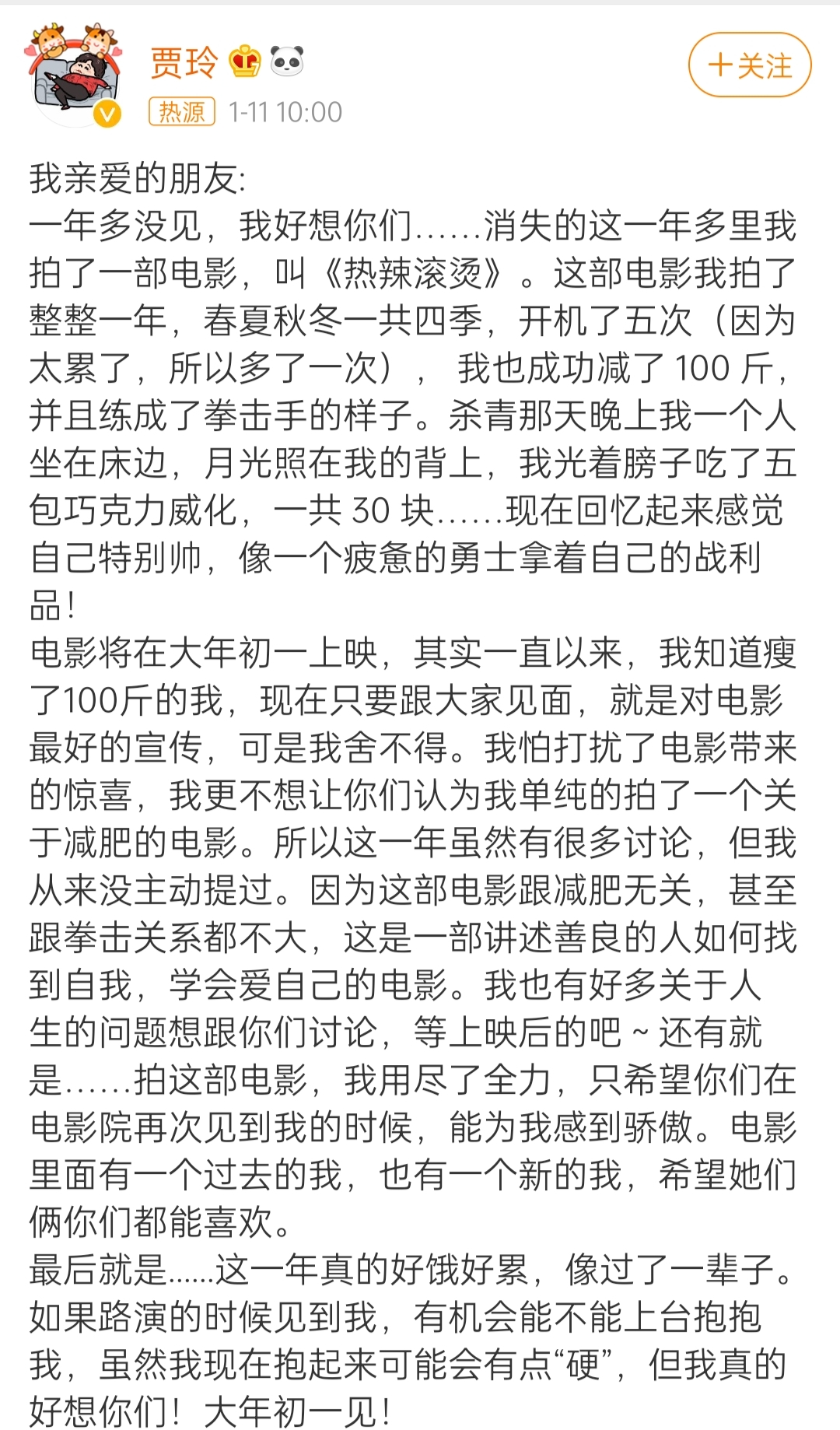 演员贾玲在社交平台上发布消息