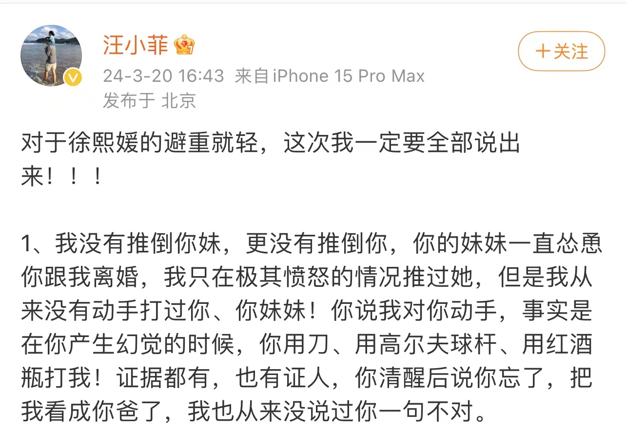 针对大S的发声,汪小菲也很快在微博上发文回应。汪小菲称没有推倒她们,并指控大S“在你昏迷的时候用刀,用高尔夫球杆,用红酒瓶打我的证据都有,也有证人,你后来说你忘了,把我看成你爸了。”
