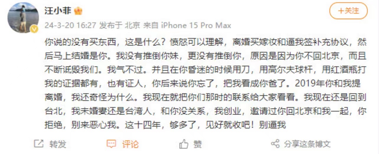 针对大S发声,汪小菲最新回应
