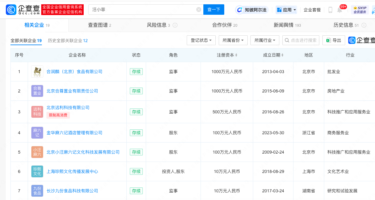 企查查APP显示,汪小菲名下关联的存续企业超10家,包括合润麟(北京)食品有限公司、北京麻六记餐饮管理有限公司等,涉及房地产、餐饮等领域。值得一提的是,汪小菲持股的合润麟(北京)食品有限公司茶饮品牌曾宣布大S为代言人,还曾申请注册“合润麟家茶 S”等商标。