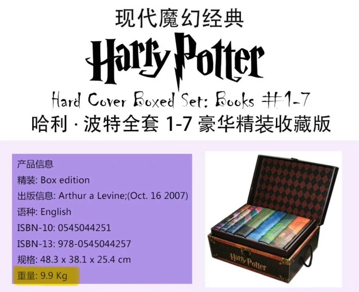随后有网友扒出《哈利波特》系列的精装版的图片。官方资料显示,这套书连盒子重量共计9.9公斤,砸在人身上确实很危险。随后,#你抄起哈利波特精装版砸向我#登上热搜,有网友调侃道:哈利波特精装版做错了什么?
