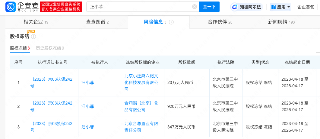 此外,汪小菲名下存在3则股权冻结信息,股权冻结数额合计1287万元,执行法院均为北京市第三中级人民法院。