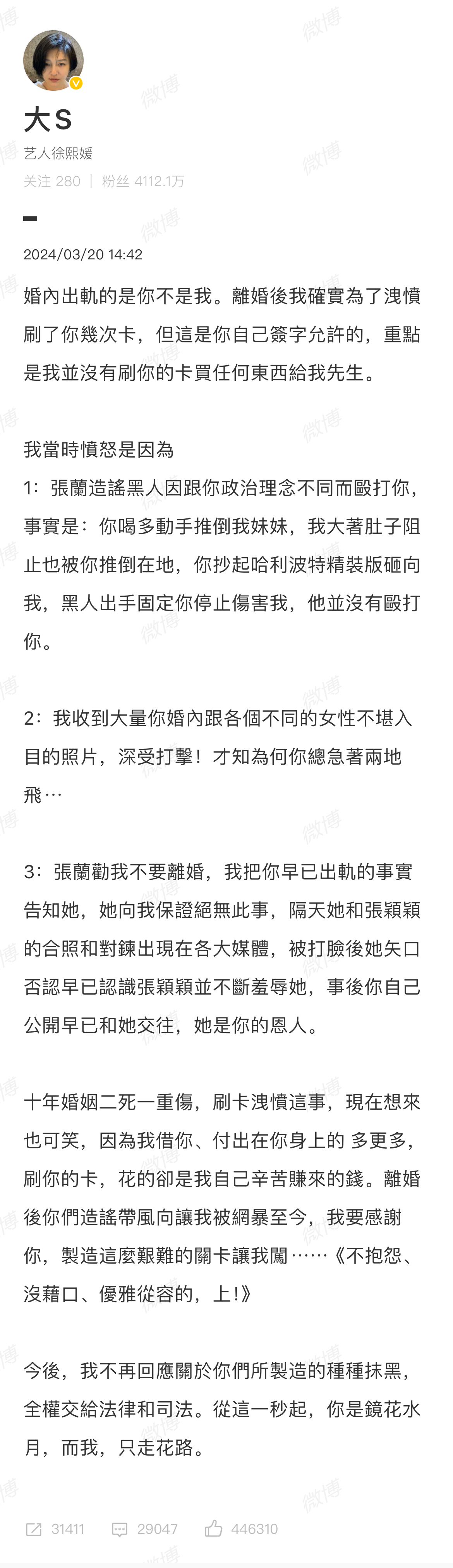 3月20日,大S发博正面回应汪小菲,指责汪小菲婚内出轨,并称刷卡是为了泄愤。大S称,今后不会再回应。针对大S的发声,汪小菲也很快发博回应。