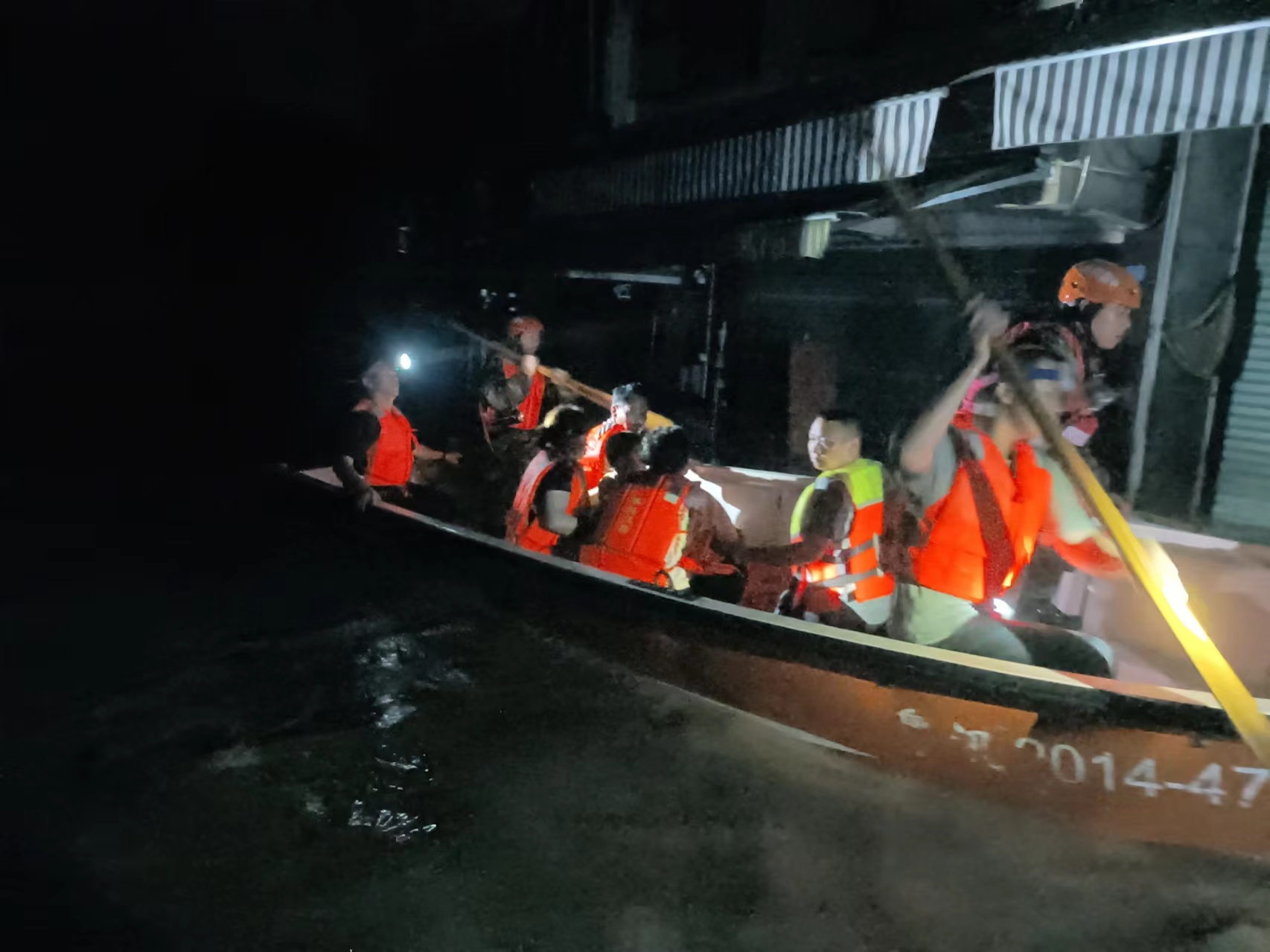 从高速公路远眺,只见大部分田地均被水淹没,居民楼仅有少数楼栋有灯光,不时有几数灯光射出,仔细看发现,是工作人员正在转移受灾群众。