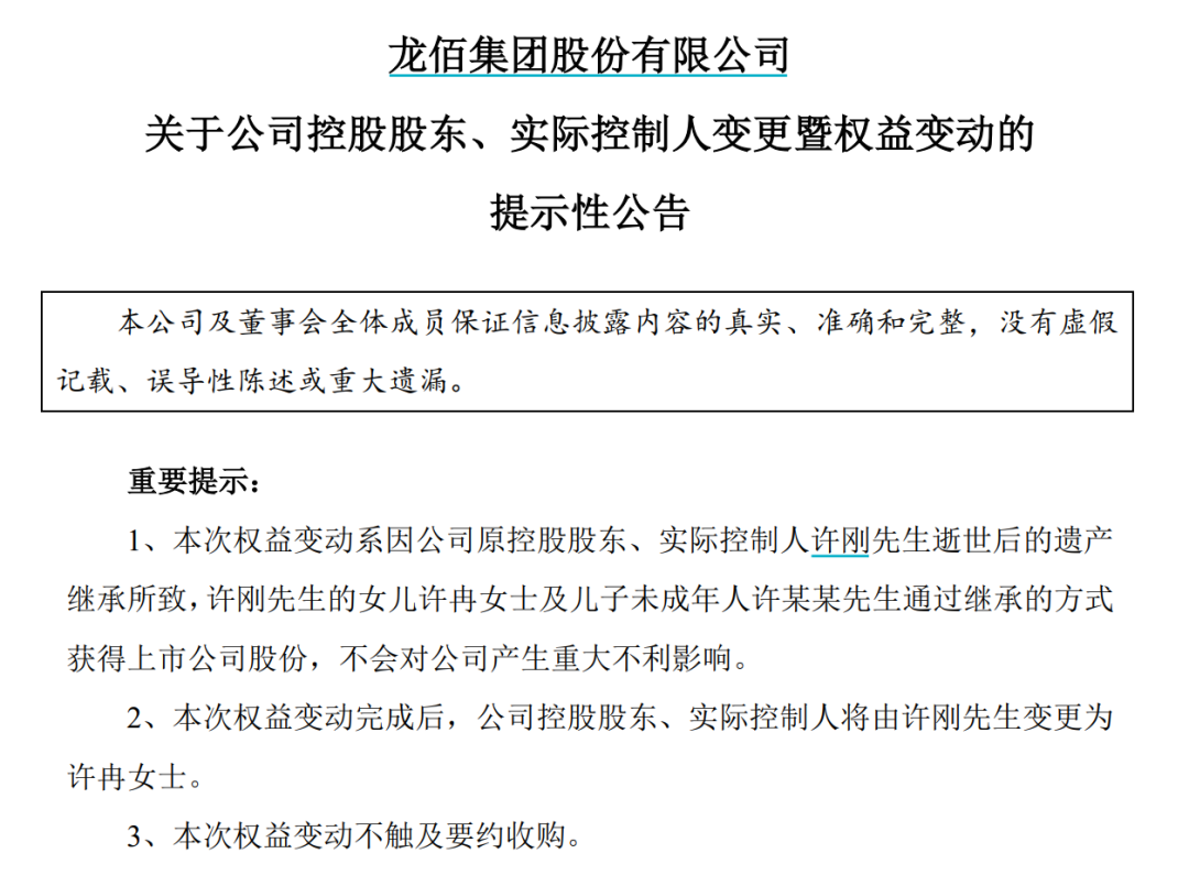 6月20日晚间,上述两家上市公司先后披露实控人变更公告,许刚生前持有的龙佰集团股份,分别由“90后”的女儿许冉和尚未成年的儿子继承。