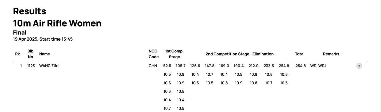 女子10米气步枪中,中国姑娘王子菲延续近期的火热状态,她在资格赛和决赛中分别打破该项目资格赛世界青年纪录以及决赛世界纪录、决赛世界青年纪录三项世界纪录,与另外两名中国选手韩佳予、范馨仡包揽女子10米气步枪项目前三名。