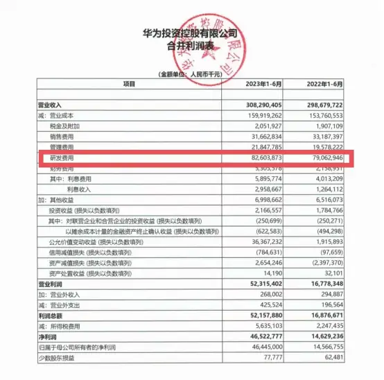 值得注意的是,2023年上半年,华为研发费用为826.04亿元,同比增加35.41亿元,上年同期为790.63亿元。