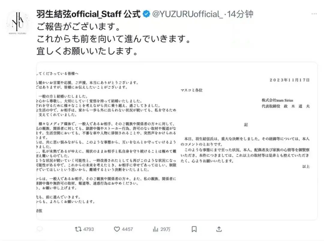 2023年11月17日晚,日本花滑名将、两届冬奥会花滑男单冠军羽生结弦,在其官方社交媒体发布公开声明,宣布离婚。2023年8月4日,羽生结弦曾突然公开宣布结婚,引发全球网络热议。
