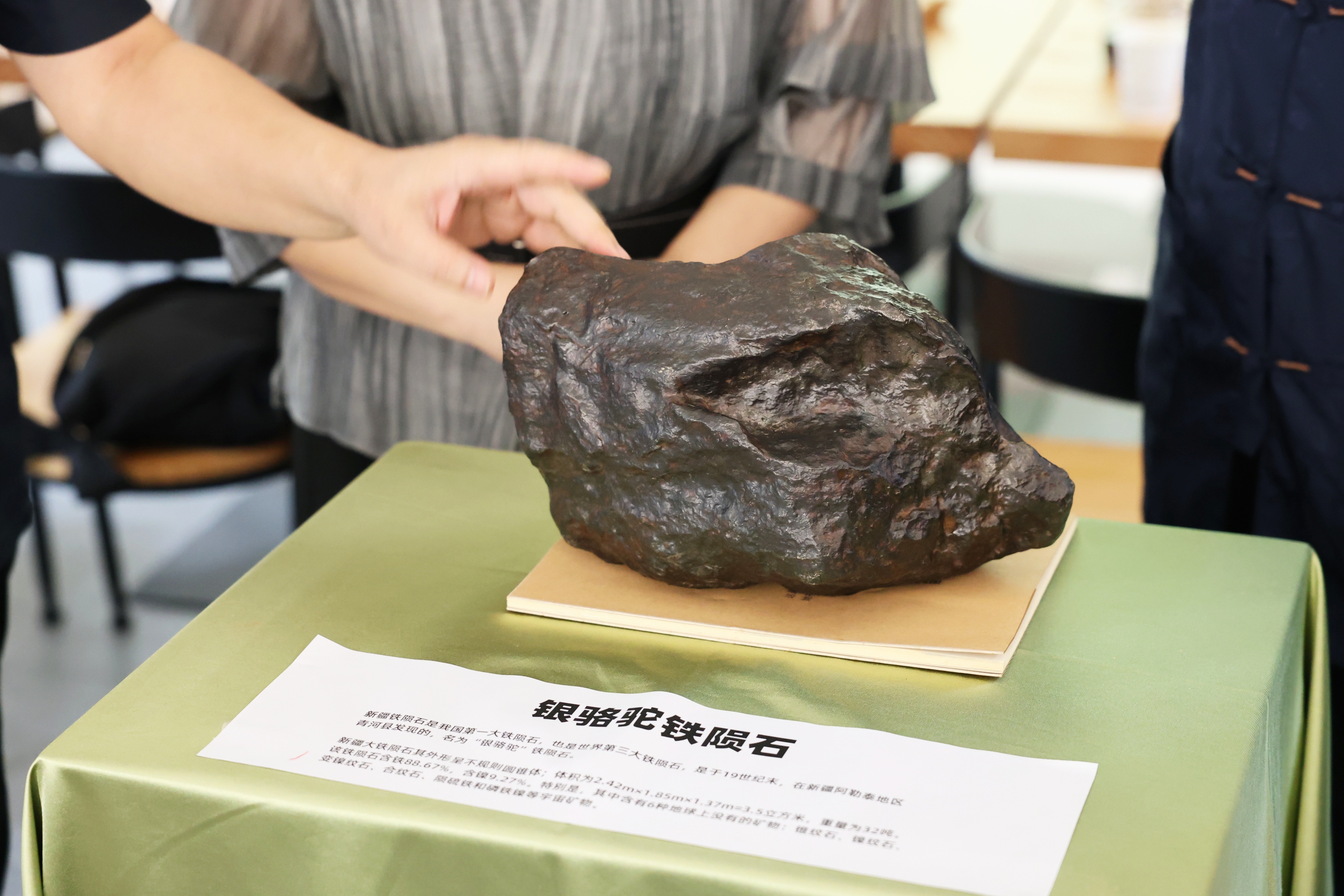 光隔着展柜玻璃看觉得不过瘾怎么办?现场还有一块于新疆阿勒泰发现的银骆驼铁陨石,可供观众现场触摸,亲手感受这一“天外来客”。别看它个头不大,重量却接近40kg,想双手捧起绝不是一件容易的事。
